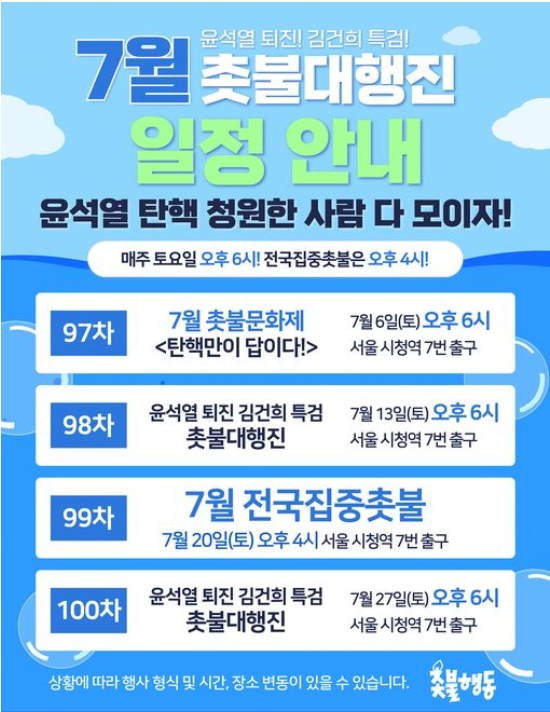 이번 7월 촛불대행진은 윤석열 대통령의 탄핵과 김건희 특검을 촉구하는 중요한 행사입니다.